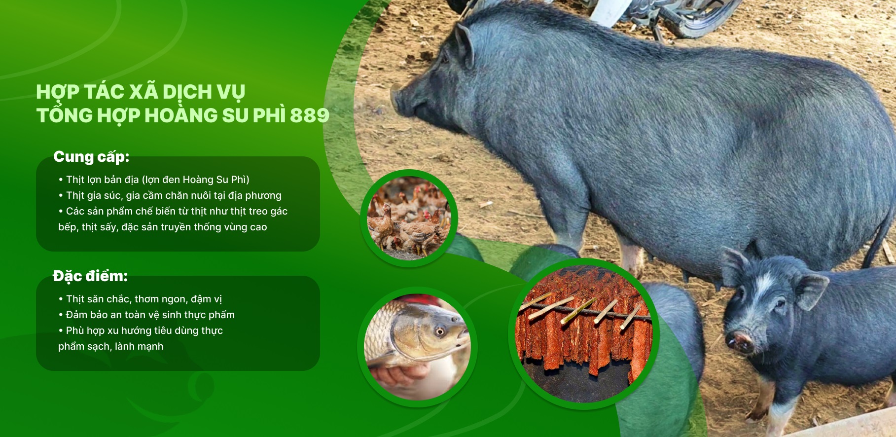 Các sản phẩm từ thịt sạch của Hợp tác xã Dịch vụ Tổng hợp Hoàng Su Phì 889 được sản xuất và phát triển dựa trên lợi thế tự nhiên của vùng núi cao Hoàng Su Phì – Hà Giang, nơi có khí hậu trong lành, thổ nhưỡng sạch và phương thức chăn nuôi truyền thống gắn với thiên nhiên. Nguồn nguyên liệu được tuyển chọn kỹ lưỡng từ đàn gia súc, gia cầm chăn thả bán tự nhiên, sử dụng thức ăn tự nhiên, không tồn dư kháng sinh, không chất tăng trọng, đảm bảo an toàn cho sức khỏe người tiêu dùng. Quy trình giết mổ, sơ chế và bảo quản được kiểm soát nghiêm ngặt, tuân thủ các quy định về vệ sinh an toàn thực phẩm. Các sản phẩm thịt sạch của HTX Hoàng Su Phì 889 giữ trọn hương vị tươi ngon, chắc thịt, đậm đà bản sắc vùng cao, phù hợp với nhiều cách chế biến như hấp, luộc, nướng, xào hay làm các món đặc sản truyền thống. Đây không chỉ là thực phẩm an toàn mà còn là kết tinh của lao động, kinh nghiệm và tâm huyết của người dân địa phương. Với phương châm “Sạch từ nguồn – An tâm đến bữa ăn”, Hợp tác xã Dịch vụ Tổng hợp Hoàng Su Phì 889 cam kết mang đến cho người tiêu dùng những sản phẩm thịt chất lượng cao, góp phần nâng cao giá trị nông sản địa phương và phát triển kinh tế bền vững cho vùng cao Hoàng Su Phì.